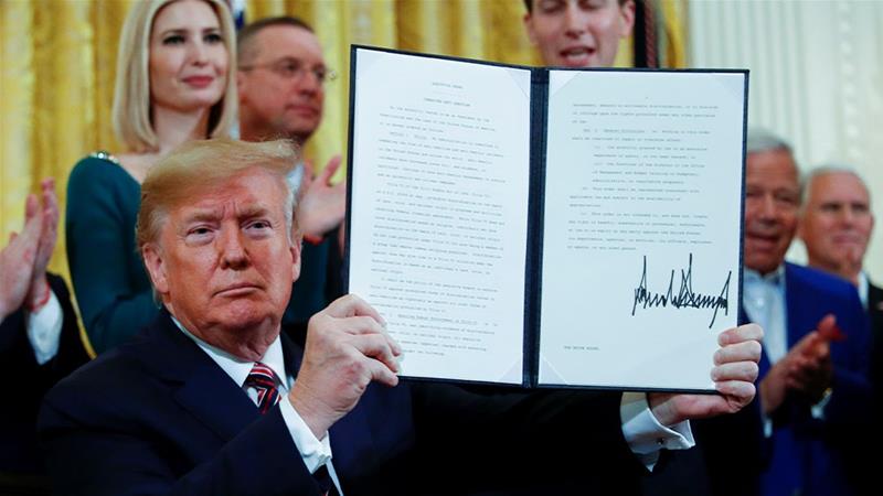US President Donald Trump holding up the executive order on anti-Semitism that he signed during a Hanukkah reception at the White House [Tom Brenner/Reuters]